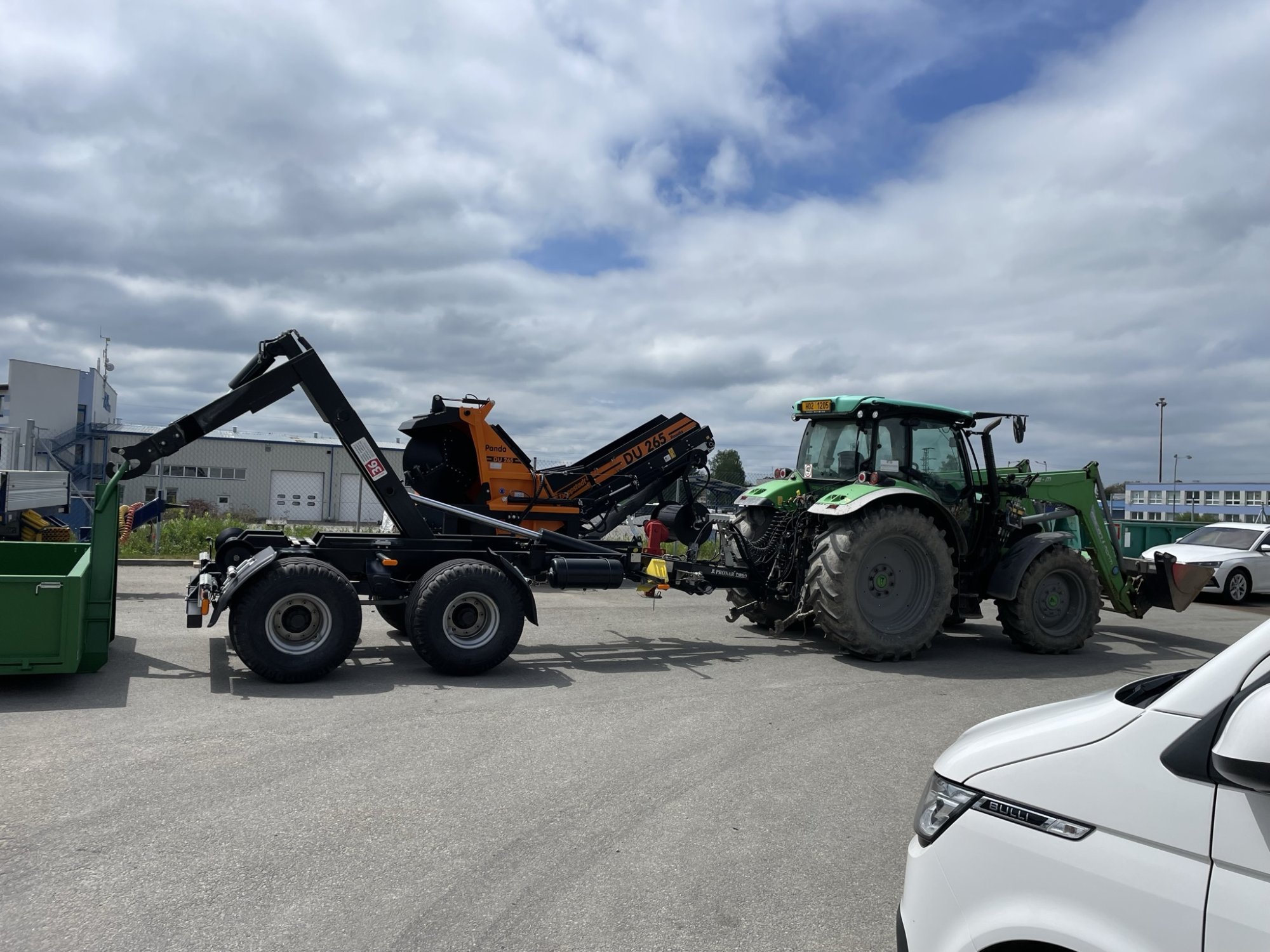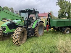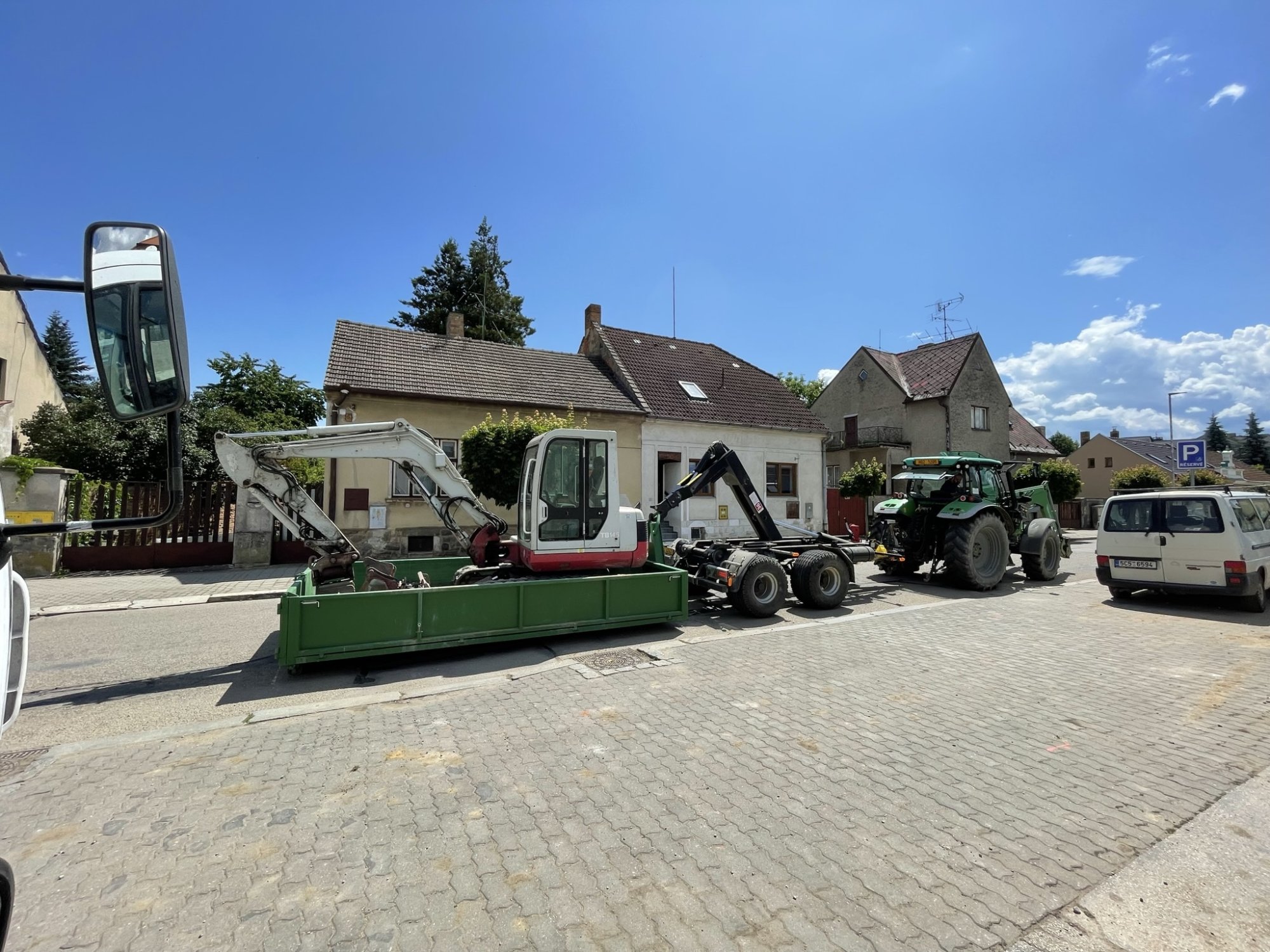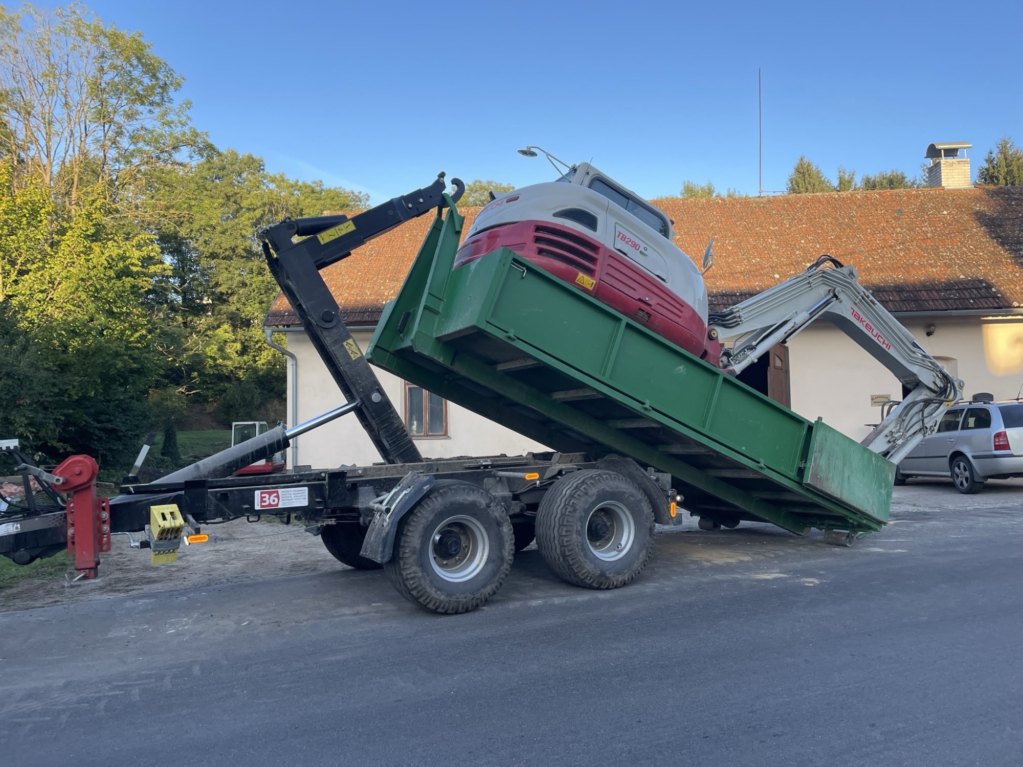 Dopravu rypadla zajišťujeme traktorem Deutz-Fahr 5130 s čelním nakladačem a nosiče kontejneru o celkové hmotnosti 15 tun, který je sklopný dozadu. Díky sklopným bočnicím lze na kontejner naložit i materiál na paletách. Návěsem lze přepravovat i sypké materiály jakou jsou kamenné drtě, štěrky, písky nebo cementové směsi. K čelnímu nakladači je možné připojit paletizační vidle a provést nakládku i vykládku palet.